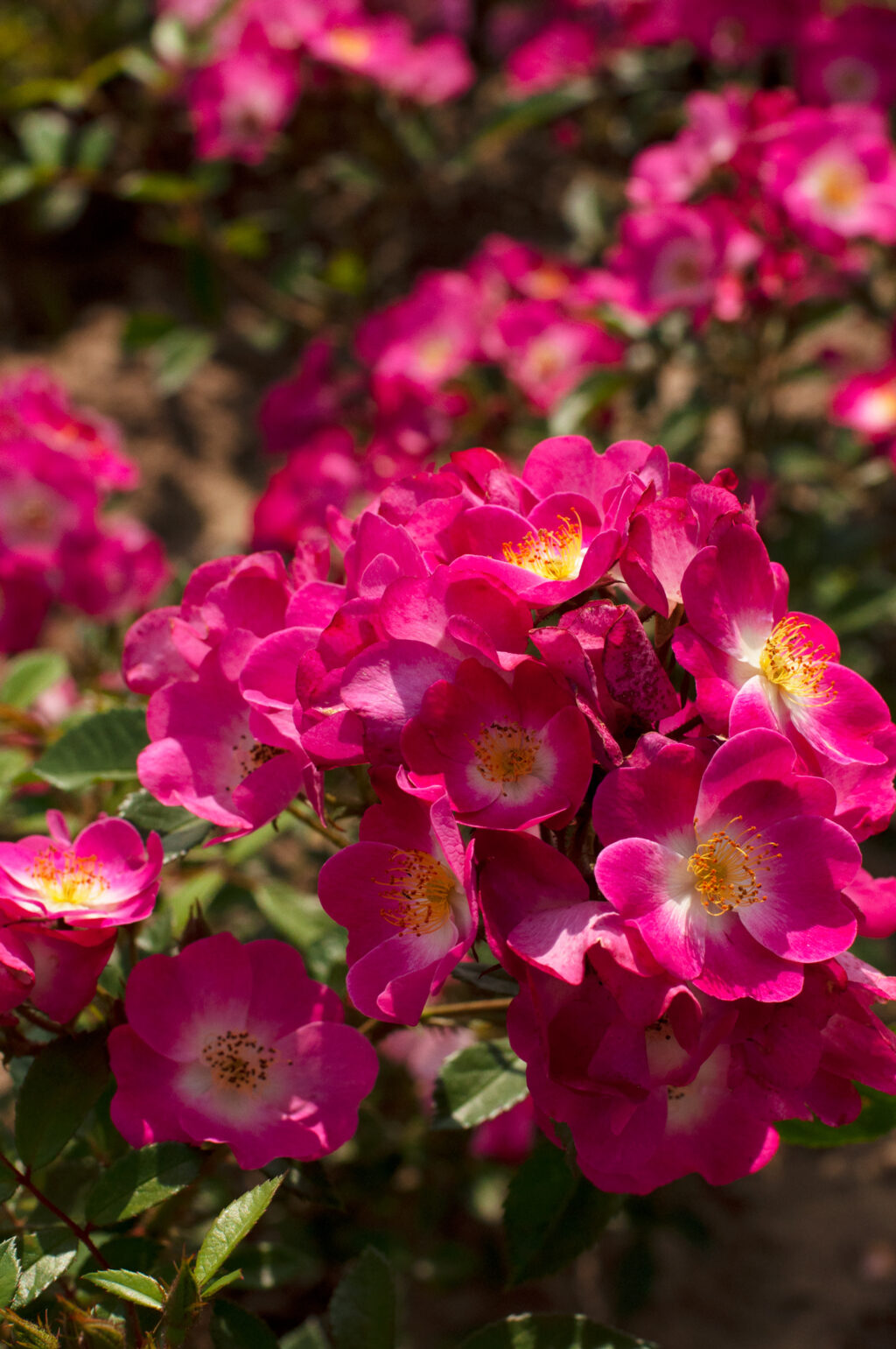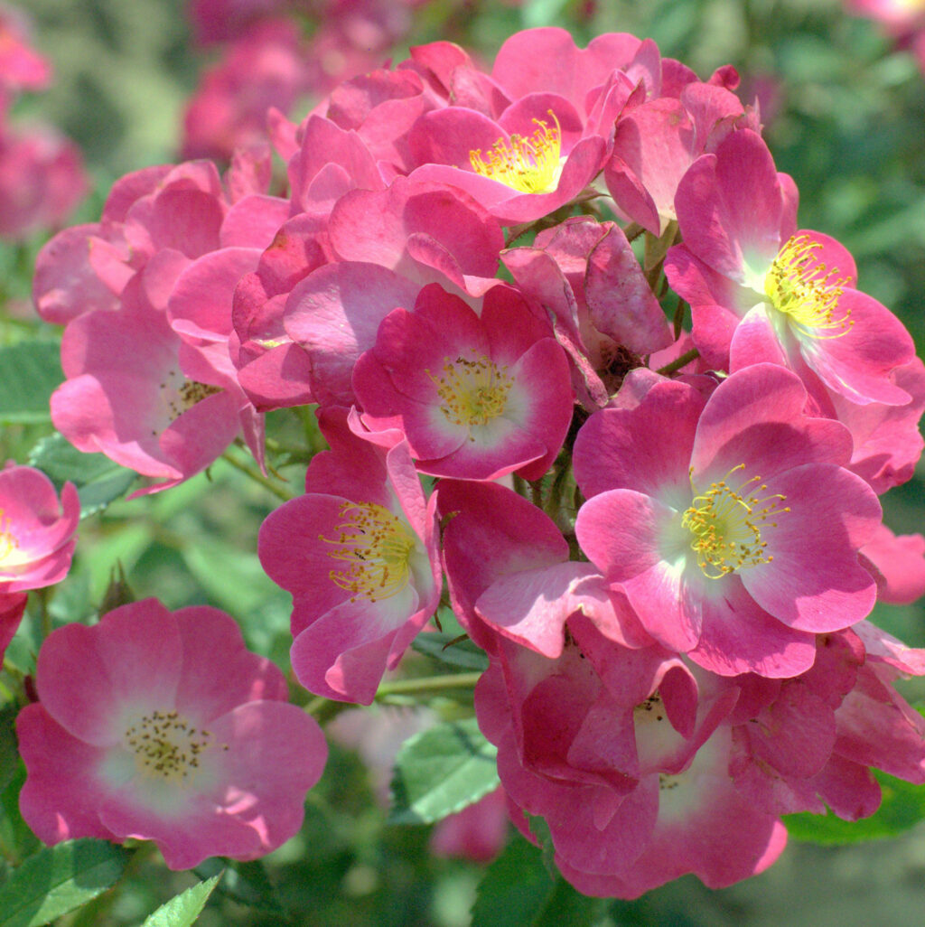 Róża piżmowa o szkarłatnych kwiatach zebranych w kwiatostany przypominające hortensje, osadzonych na przewieszających się pędach. Odporna na choroby grzybowe i deszcze, dobrze znosi półcień. Jesienią zawiązuje dekoracyjne, pomarańczowe owoce, które zdobią krzewy przez całą zimę, a ponadto stanowią źródło pożywienia dla ptaków.
