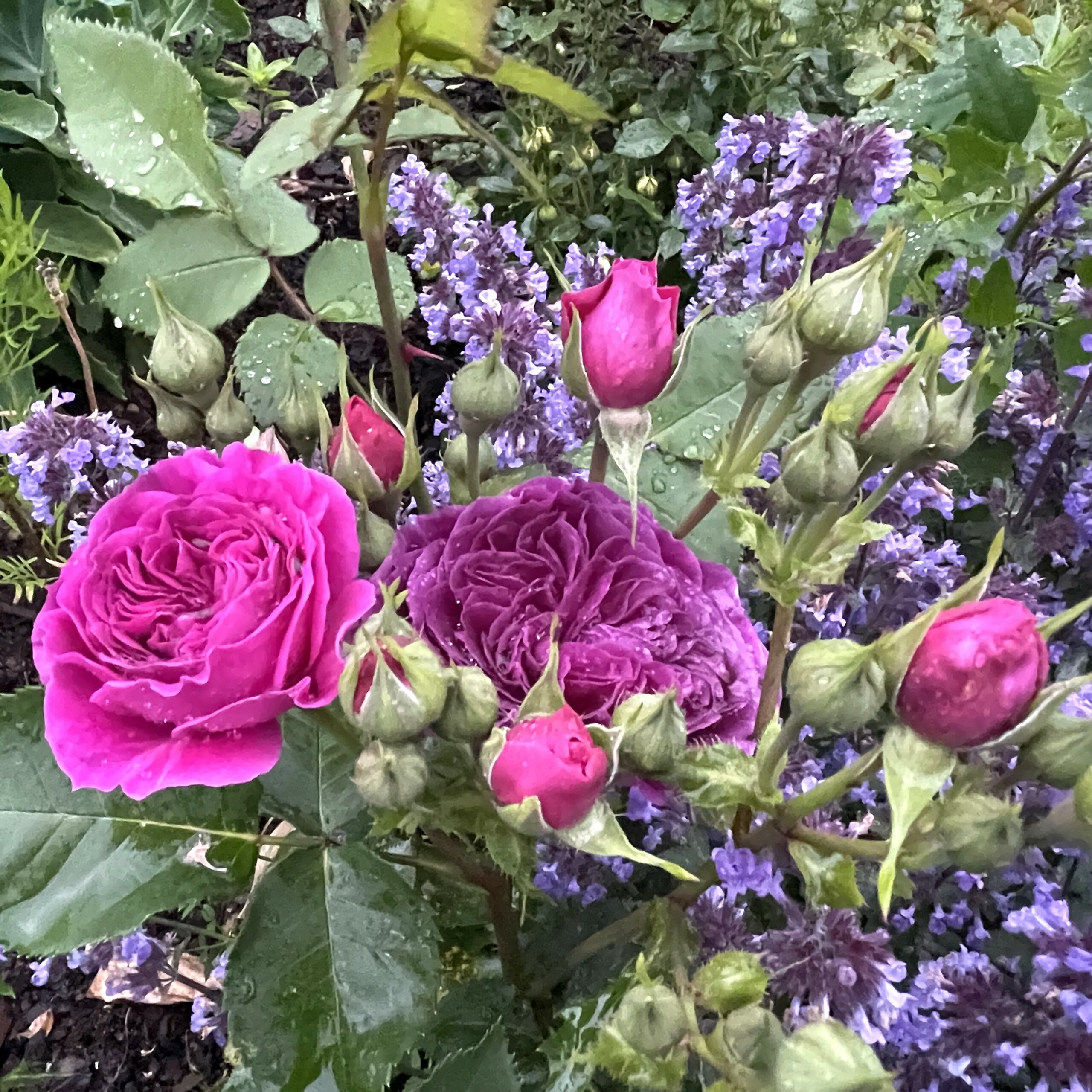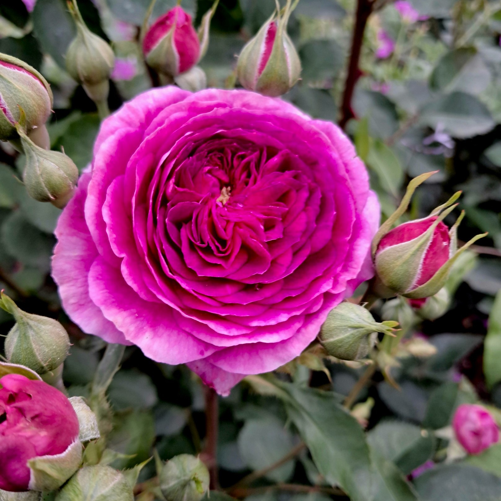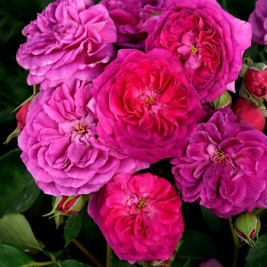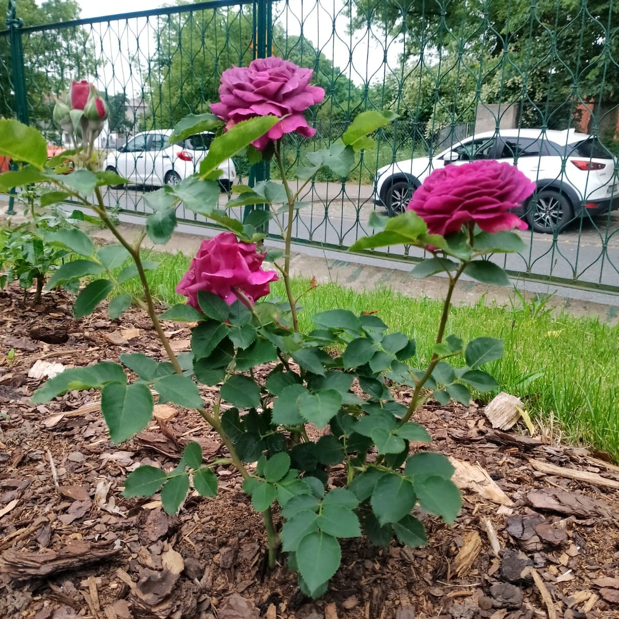 Róża parkowa o dużych, ćwierćrozetowych kwiatach, nawiązujących stylem do odmian historycznych. Ciemnofioletowe, gęsto osadzone płatki najpełniej pokazują głębię barwy w półcieniu, gdzie zachowują nasycenie i subtelny połysk. Kwiaty mają niezapomniany zapach łączący klasyczną woń róż z łagodną nutą drewna i aromatem słodkich malin.