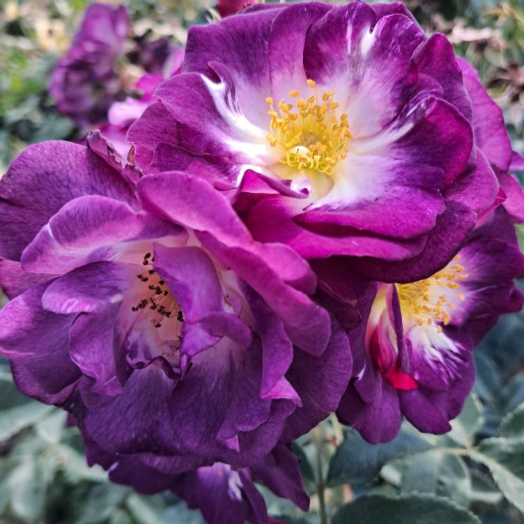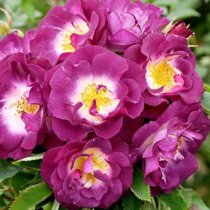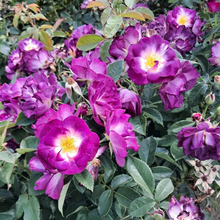 Niewysoka róża parkowa o intrygującej barwie kwiatów w odcieniu adwentowego, głebokiego fioletu, z jaśniejącymi krawędziami płatków i kremowym środkiem wypełnionym złocistymi pręcikami. Największym atutem tej odmiany jest jej niepowtarzalny zapach łączący aromat świeżo startej gałki muszkatolowej z wonią pieprzu i światecznych przypraw.