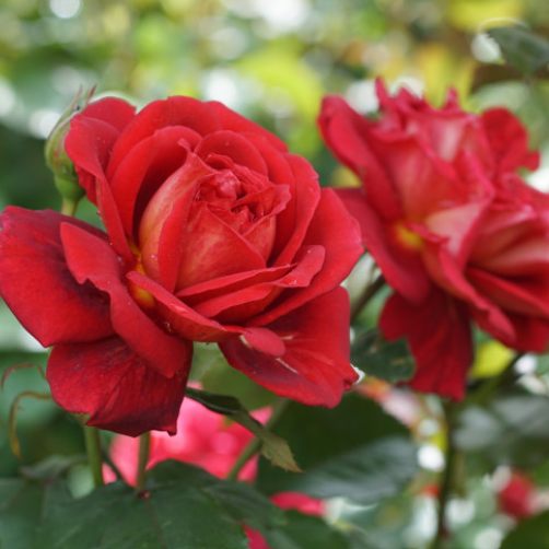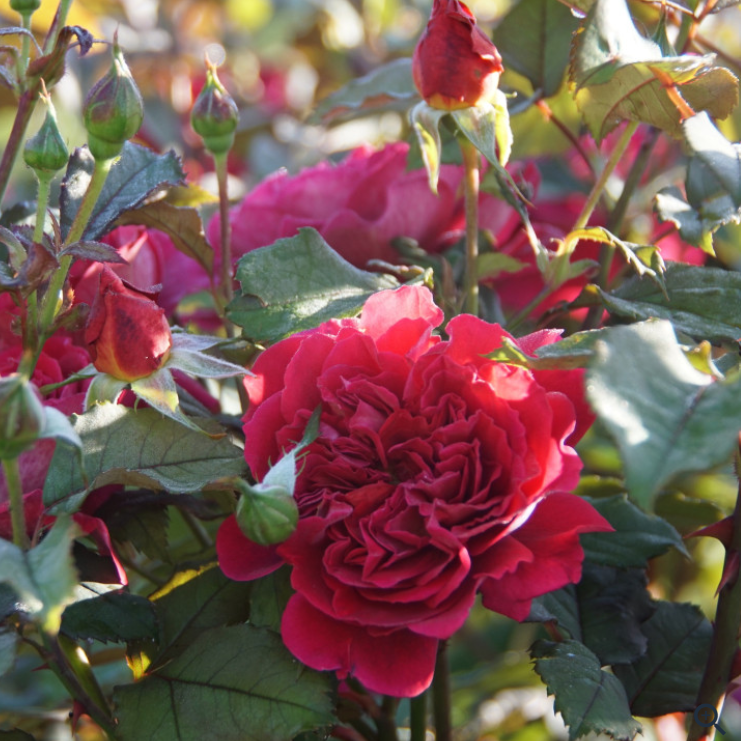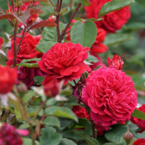 Róża zwracająca uwagę dużymi, bardzo pełnymi, karminowo czerwonymi, aksamitnymi płatkami. Rozwijając się ukazują złociste pręciki, które ładnie komponują się z żółtymi przebarwieniami na zewnętrznych płatkach. Kwiaty zebrane w grona liczące po 5 – 7 pąków mają wyraźny zapach dawnych róż.