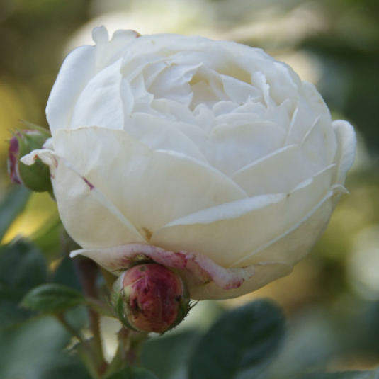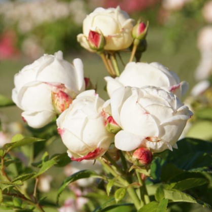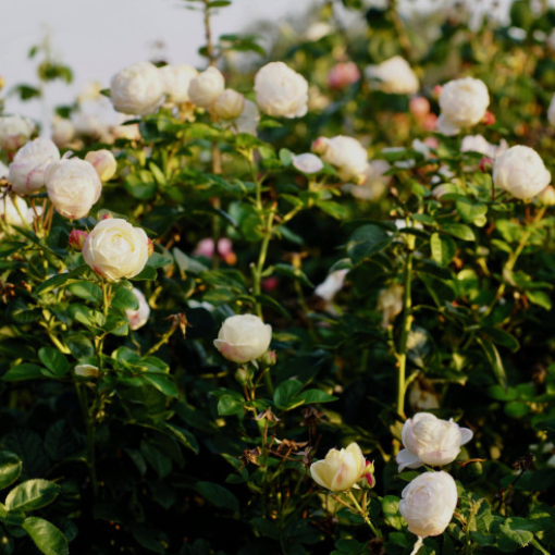 To zaskakująca róża, która z niewielkich, pomarańczowo czerwonych pąków rozwija śliczne, delikatne kwiaty w kształcie pomponów, w odcieniach od kości słoniowej po czystą biel. Zebrane w grona po 5 – 6 sztuk, roztaczają delikatny zapach z nutami mirry i anyżu.