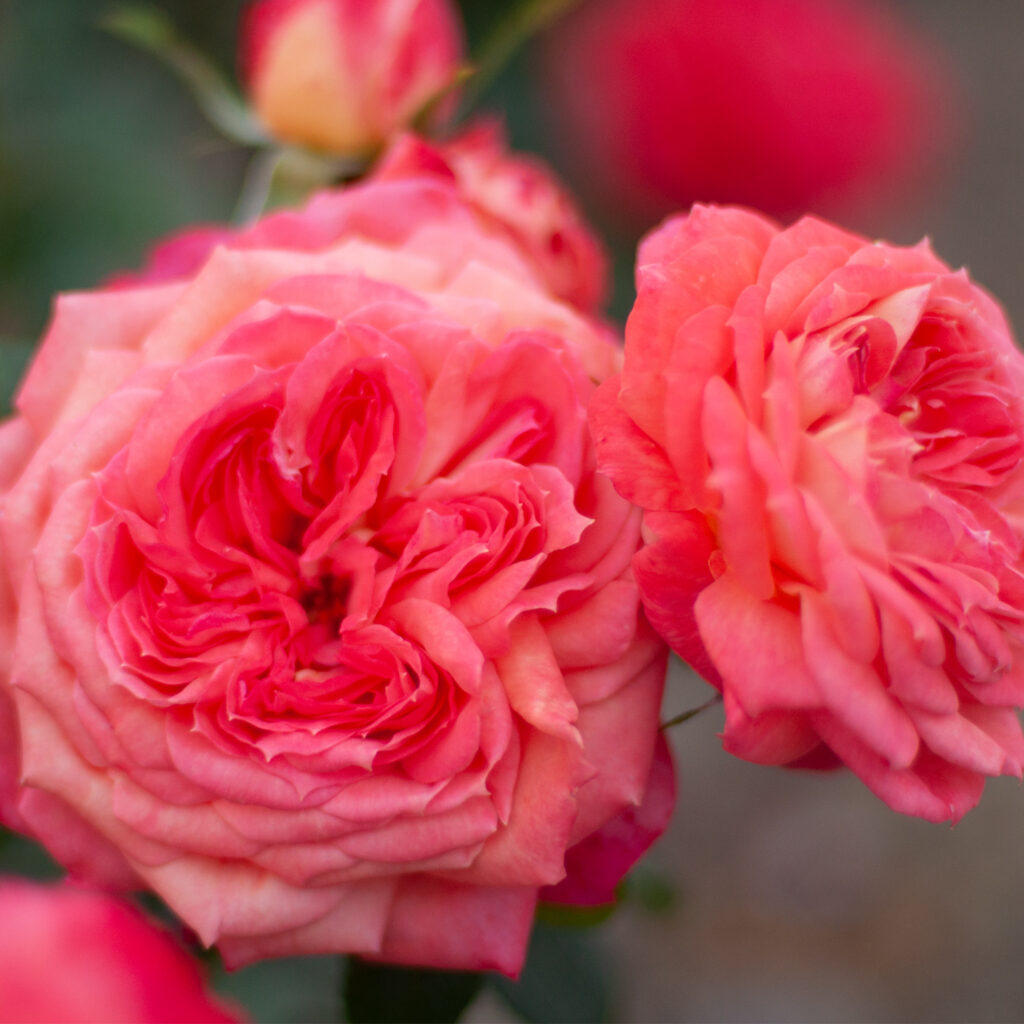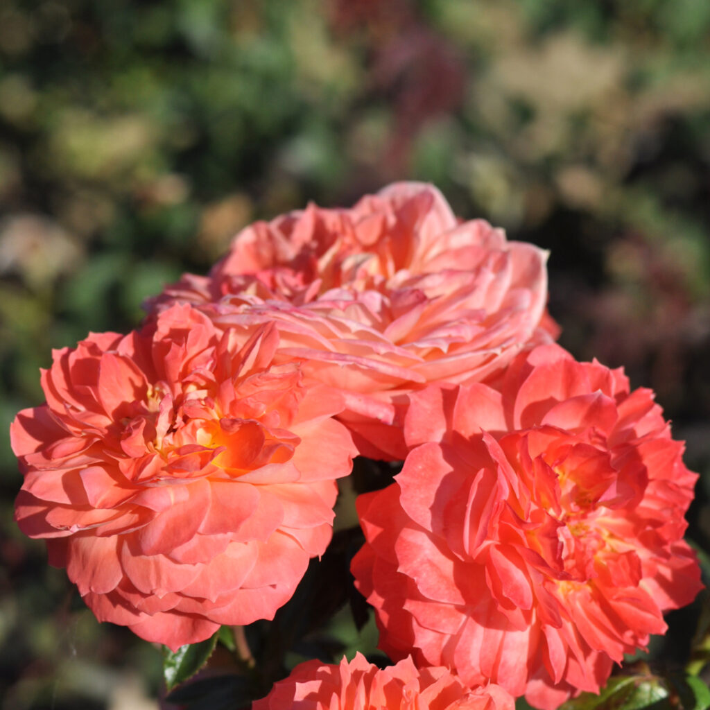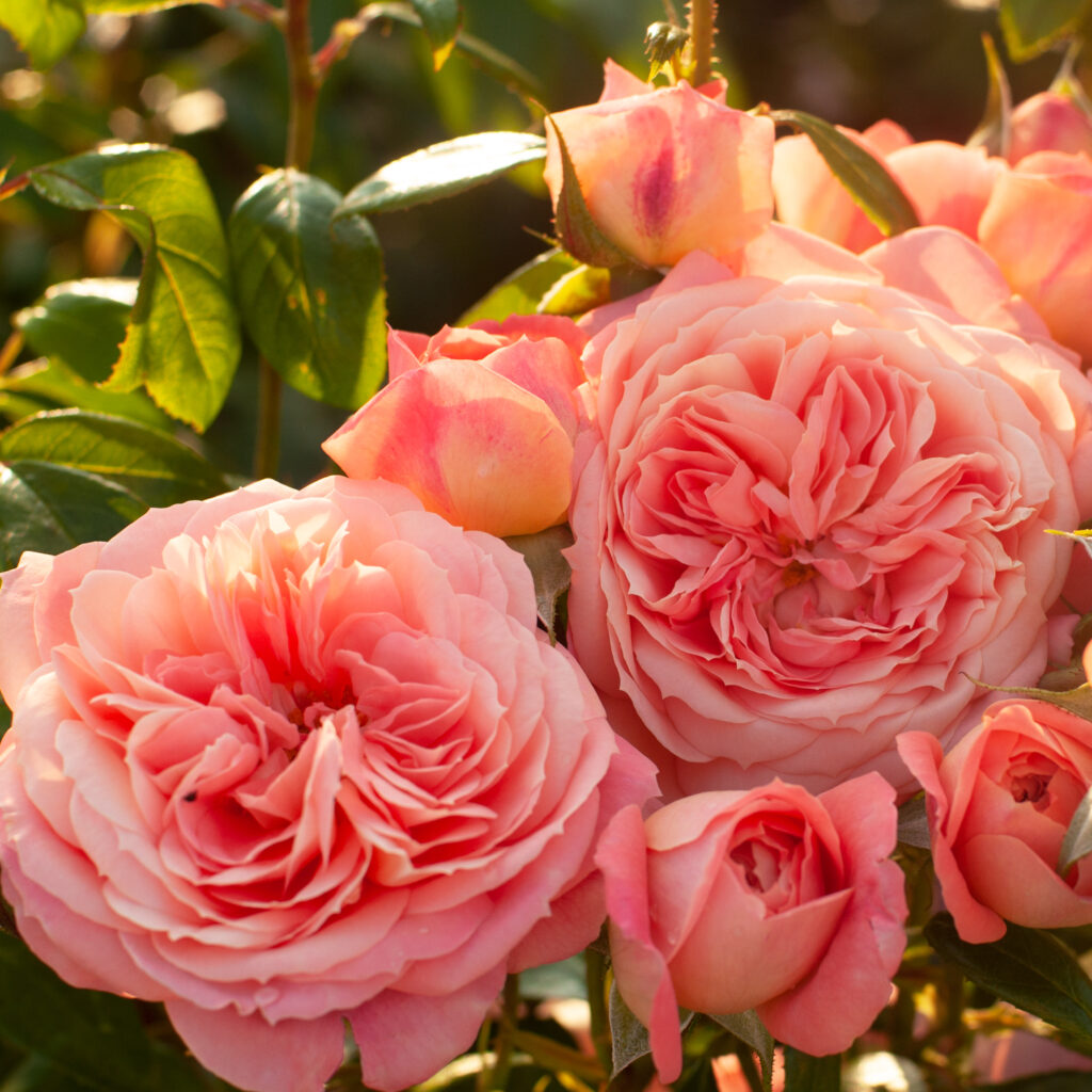 Róża „bajkowa” o kulistych, bardzo pełnych kwiatach w jaskrawym, zwracającym uwagę kolorze i ciemnozielonych liściach.