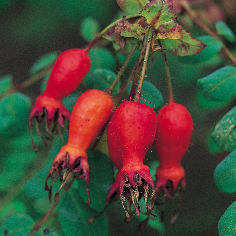 Jedna z ciekawszych odmian pochodzącej z Chin róży dzikiej Rosa moyesii. Pojedyncze kwiaty w kolorze intensywnej czerwieni, z zachodzącymi na siebie płatkami i żółtymi pręcikami, jesienią przeksztalcają się w oryginalne, wydłużone owoce w kształcie flakonika. Wygląda wtedy szczególnie dekoracyjnie. Krzewy silne, rozłożyste, o łukowato wygiętych pędach prawie pozbawionych kolców i dość drobnych liściach. Idealna róża do ogrodów naturalistycznych i na trudniejsze stanowiska. Dobrze radzi sobie z mrozami.