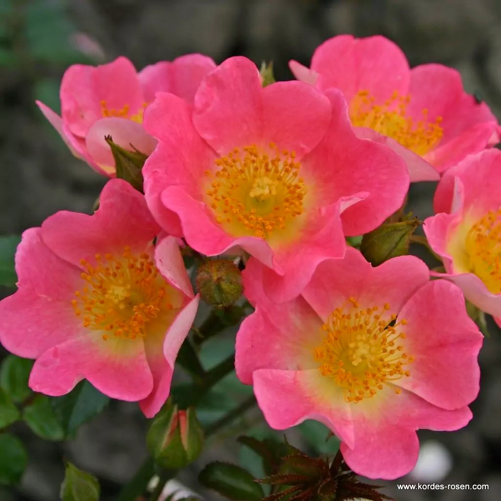 Róża o drobniutkich, ślicznych kwiatach w kolorze malinowego różu, z wyraźnymi żółtymi pylnikami. Kwiaty zebrane w obfite, delikatnie pachnące kwiatostany, okrywają rozłożyste krzewy zwartym kobiercem. Po kwitnieniu płatki osypują sie same nie szpecąc krzewów, a na pędach powstają kolejne pąki.