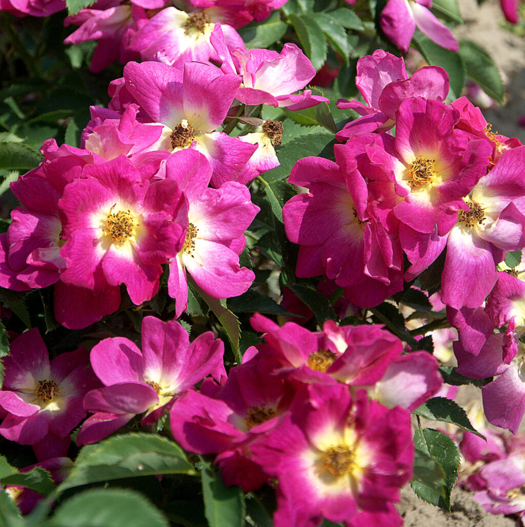 Róża z pięknymi purpurowo-fioletowymi kwiatami w kształcie kielicha z intensywnie żółtym środkiem i złotymi pręcikami. Jest bardzo odporna na choroby i mróz, posiada certyfikat ADR.